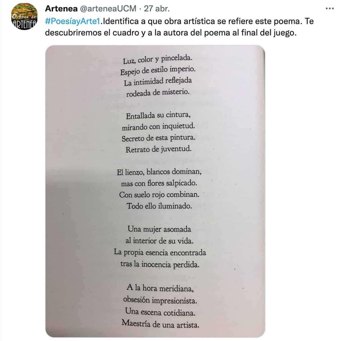 En 2022, @arteneaUCM (Arte y Periodismo), de la Facultad de Ciencias de la Información, proponía a los alumnos un juego en redes sociales con varios de mis poemas, retando a los alumnos a descubrir qué obras de arte escondían mis versos.