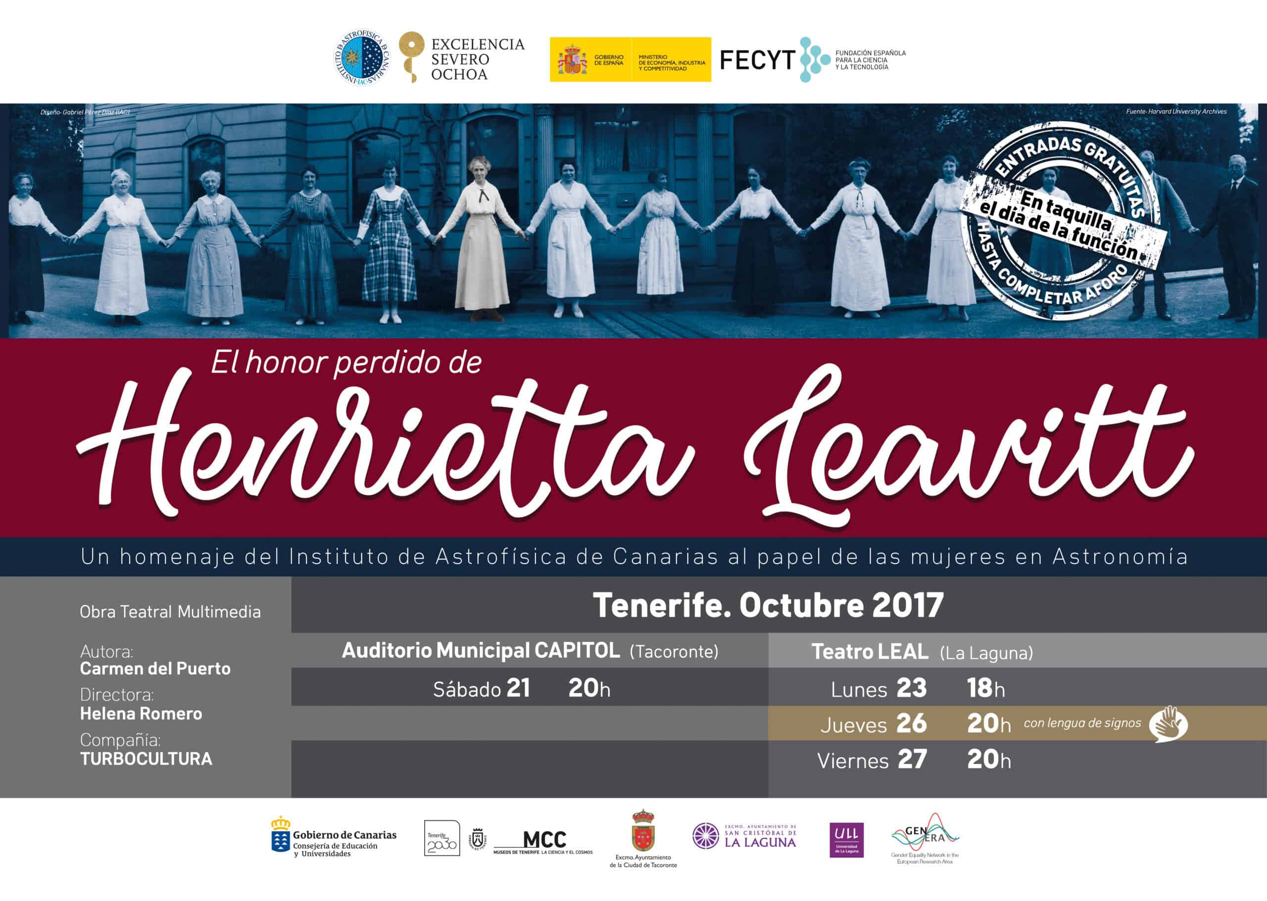 “El regreso de Henrietta Leavitt. De la escuela a la carrera investigadora pasando por el teatro” es una iniciativa del Instituto de Astrofísica de Canarias (IAC), con la colaboración de la Fundación Española para la Ciencia y la Tecnología (FECYT) del Ministerio de Economía, Industria y Competitividad. Este proyecto comprende una serie de actividades gratuitas de divulgación científica que partirá de la reposición del espectáculo teatral multimedia El honor perdido de Henrietta Leavitt. Las funciones tendrán lugar del 20 al 27 de octubre en el Auditorio Municipal de Tacoronte y en el Teatro Leal de La Laguna, por lo que el proyecto contará con la colaboración de los respectivos Ayuntamientos de estos municipios.